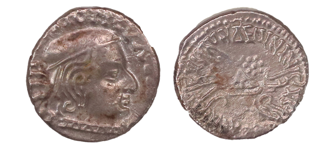 Western Kshatrpas, Nahapana, Silver Drachms, 2.26gms, OBV: Bust of Nahapana facing to right, around corrupt Greek inscriptions, REV: Arrow and thunderbolt with Kharoshti legend and Brahmi legend ‘Rajno Kshaharatasa Nahapanasa’ on left field. (Pieper # 3352). Very Fine.