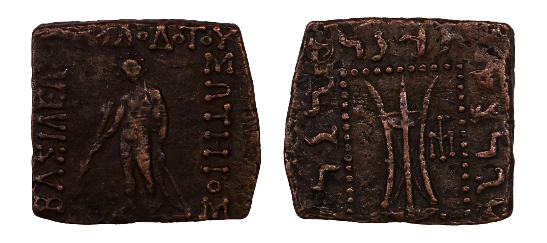 Indo-Greek, Apollodotus I (c. 180-160 BC), Square Copper Quadruple Unit, 8.32g, OBV: Apollo standing facing, with quiver over shoulder, holding arrow in right hand and left hand resting on grounded bow with Greek legend, REV: Tripod with Kharoshthi legend. (Bopearachchi & Rahman # 206). Fine.