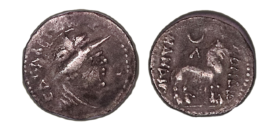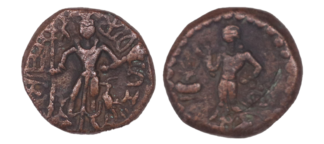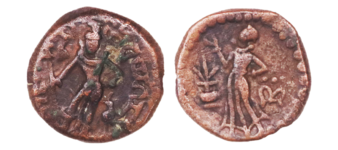 Tribe of the Punjab, Yaudheya, Karttikeya-Devasena type, Copper Unit, 10.98gms, OBV: Karttikeya standing facing to right, holding spear in his right hand, a small bird near his left foot and around Brahmi legend ‘Yaudheya ganasya jaya dvi’, REV: Devasena, the spouse of the lord, standing left in dotted border, kalasa on left and triratna symbol on right side. (D. Handa # Pl. LXXII).