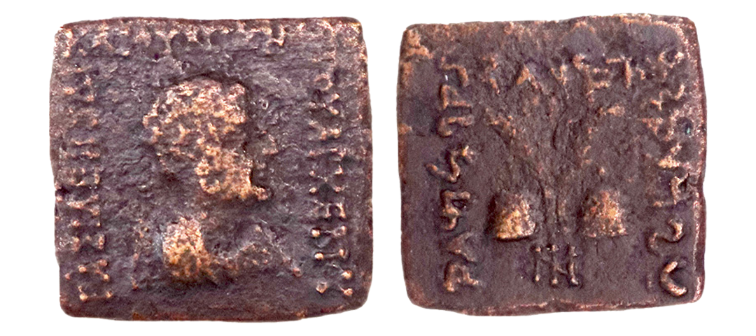 Indo-Greek, Apollodotus I (c. 180-160 BC), Square Copper Quadruple Unit, 8.78gms, OBV: Apollo standing facing, with quiver over shoulder, holding arrow in right hand and left hand resting on grounded bow with Greek legend, REV: Tripod with Kharoshthi legend. (Bopearachchi & Rahman # 206).