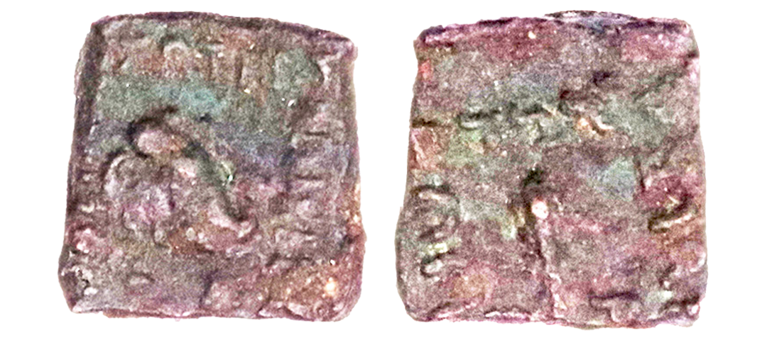 Indo-Greeks, Antialcidas (c. 115-95 BC), Copper Square Unit, 9.24gms, OBV: Diademed bust of the king to right holding thunderbolt on shoulder with Greek legend around , REV: Cap of Dioscuri with palms in center and Kharoshthi legend. (Bopearachchi & Rahman # 460). Fine.