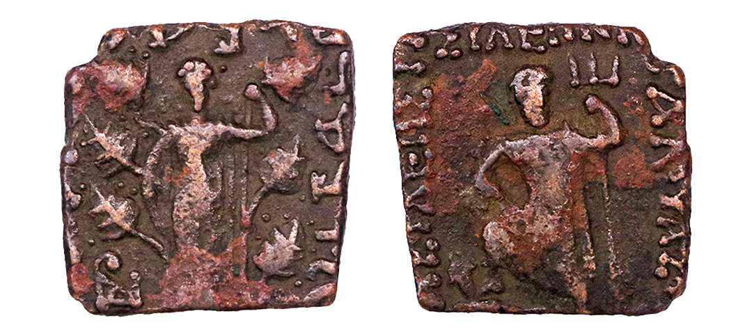 Indo-Greeks, Pushkalavati Mint, Menander I (155 - 130 BC), Copper Square Unit, Obv: elephant head right, trunk raised, bellsuspended from neck, with legend around BAIE THPO MENANPO, Rev: kharoshthi legend, 'maharajasa tratarasa menandrasa' (Great King Savior Menander), club of herakles, vertical, handle down, monogram left, A right, about very fine, Rare.