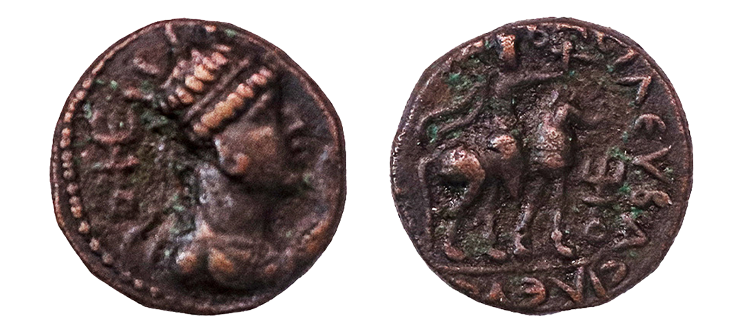 Ancient India, Kushana Dynasty, Soter Megas alias WimaTakto (c. 90-113 AD), Copper Drachm, 8.25gms, OBV: Bust of the Kushan ruler to right wielding a spear in front of his face and behind monogram, REV: The king mounted on a horse to right with Kharoshti legend around and monogram front of horse. (Mitch # ACW 2939). Fine+.