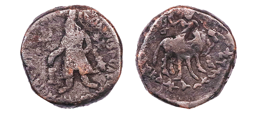 Ancient India, Kushana Dynasty, Soter Megas alias WimaTakto (c. 90-113 AD), Copper Drachm, 8.34gms, OBV: Bust of the Kushan ruler to right wielding a spear in front of his face and behind monogram, REV: The king mounted on a horse to right with Kharoshti legend around and monogram front of horse. (Mitch # ACW 2939). Very Fine.