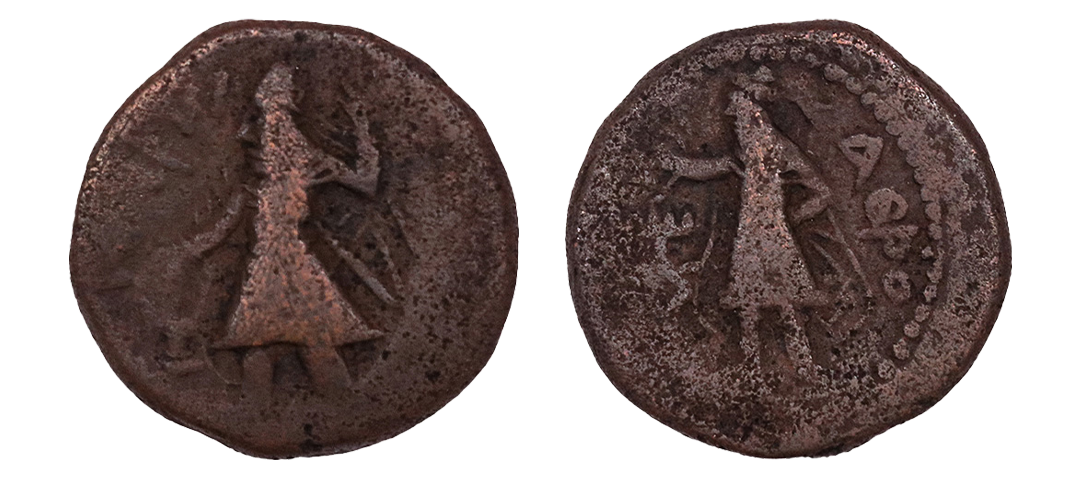 Ancient India, Kushana Dynasty, Soter Megas alias WimaTakto (c. 90-113 AD), Copper Drachm, 8.34gms, OBV: Bust of the Kushan ruler to right wielding a spear in front of his face and behind monogram, REV: The king mounted on a horse to right with Kharoshti legend around and monogram front of horse. (Mitch # ACW 2939). Very Fine.