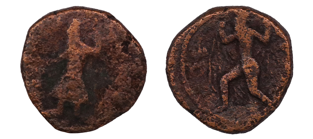 Ancient India, Kushanas, Soter Megas alias Wima Takto (c. 90-113 AD), Copper Drachma, 2.06gms, OBV: Bust of Soter Megas facing right holding spear in front of face and monogram behind the head of king, REV: The King mounted on a horse to right with around Kharoshti legend.