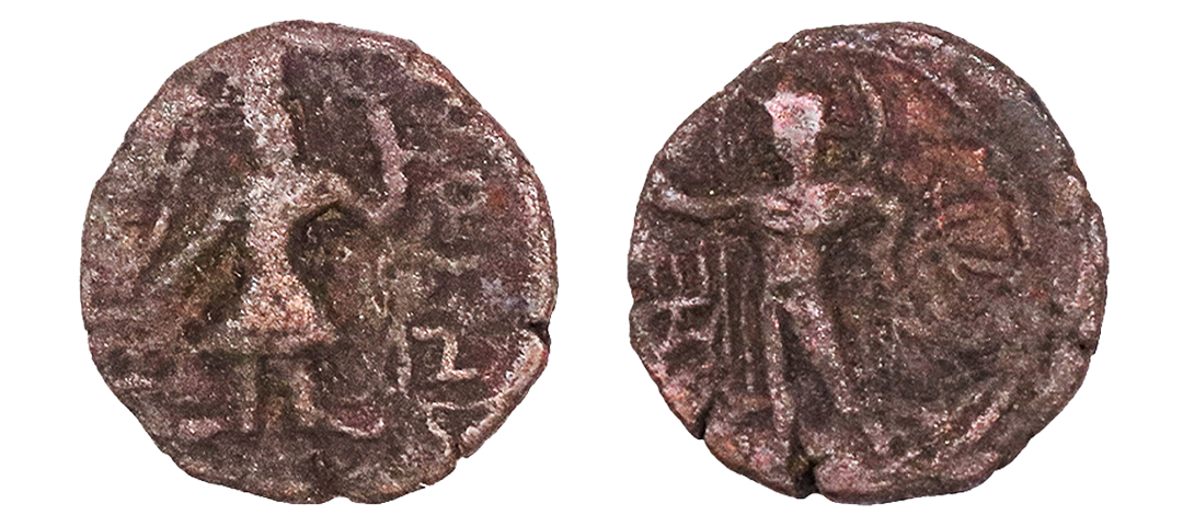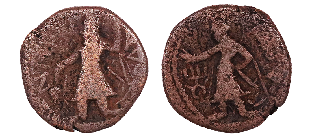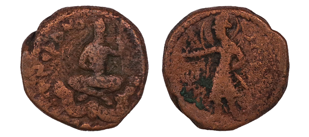 Ancient India, Kushans, Kanishka I (c. 127-158 AD), Copper Drachma 16.78gms, OBV: King standing facing beside fire altar, holding trident in right hand traces of Greek legend around, REV: Wind god VADO running to left, tamgha on left field and label on right side. (Jongeward, Cribb & Donovan # pl. 18). Fine.