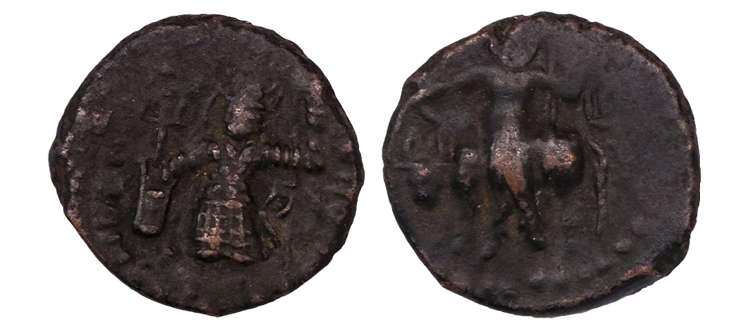 Ancient India, Kushana Dynasty, Huvishka (c. 158-195 AD), Copper Unit, 15.44gm, Obv: King half reclining on couch with one leg on ground and the other on the couch with hands on waist, Rev: God of metals Athsho standing facing to left, Tamgha on left and lable on right. (Mitch ACW # 3236). Fine.