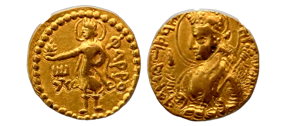 Ancient India, Kushana Dynasty, Huvishka (c. 158-195 AD), Copper Unit, 9.19gms, OBV: King half reclining on couch with one leg on ground and the other on the couch with hands on waist, REV: God of metals Athsho standing facing to left, Tamgha on left and lable on right.