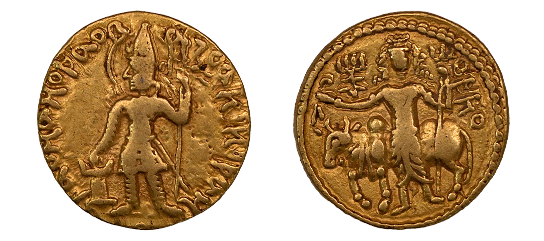 Ancient India, Kushana Dynasty, Huvishka (c. 151-190 AD), Copper Unit, 9.59gms, OBV: King mounted on elephant walking to right around Greek legend, REV: Goddess MIORO facing to left, tamgha and lable partly visible. Fine.