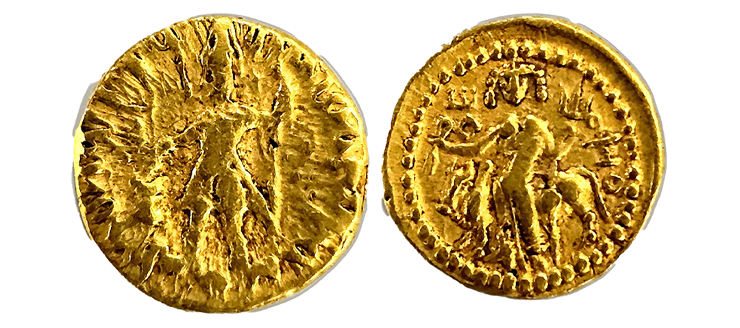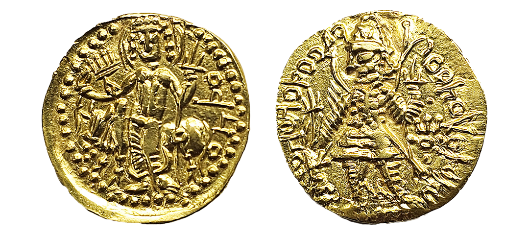 Ancient India, Kushans, Vasudeva I (c. 190-230 AD), Gold Dinar, 7.68g, OBV: King nimbate standing left, holding a trident to right, making an offering at an altar to left, above which is a garlanded trident with Greek legend PaonanopaoBazohoKopano, REV: Shiva standing facing with Nandi bull, holding a trident in right and noose in left, tamgha in upper left field with label Ohpo. (Jongeward, Cribb & Donovan # 1082). Scarce.