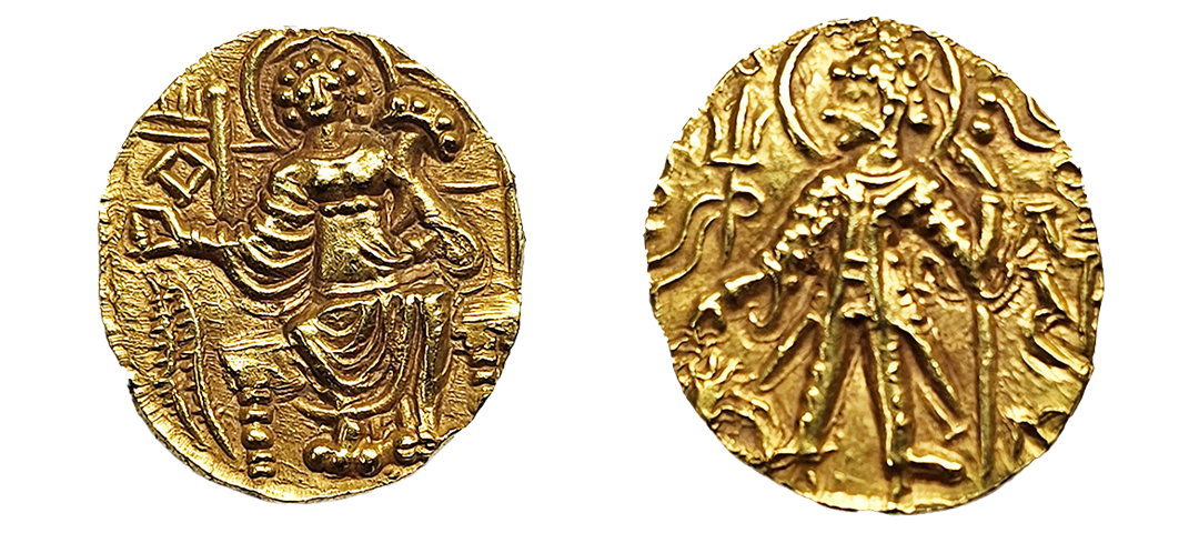 Ancient India, Kushanas, Kanishka II (c. AD 230-247). Gold Dinar, 7.70gms, OBV: king standing left, holding a trident in right hand, making an offering at an altar at left, garlanded trident above altar, Brahmi letter ’Pri’ to right, ’La’ to left of legs, REV: nimbate Ardoksho enthroned facing, holding garland and cornucopia, tamgha in upper left field and legend in right field.
