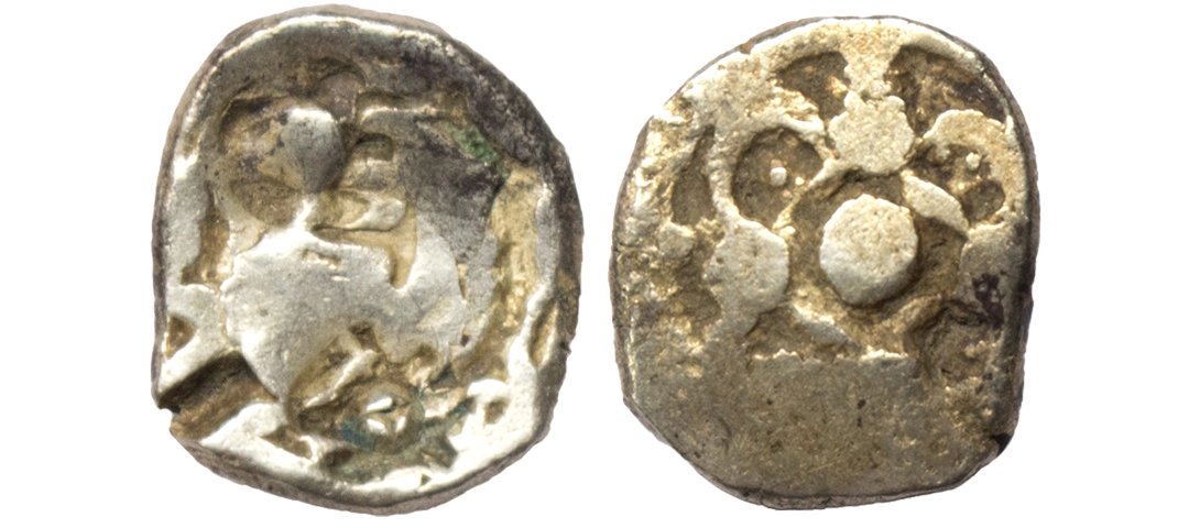 Ancient, Archaic Series, Punch Marked Coinage, attributed to Pauravas of Kaushambi (c. 400-350 BC), Silver 1/2 Karshapana, this is a single symbol coin, depicting a turtle on obverse and a bankers’ mark on reverse. This series has been attributed to the Pauravas of Kaushambi. As per Puranas, on account of heavy floods in Hastinapur, a line of descendants of Pandavas and Kauravas (what was left of them after the famous Mahabharat war) left Hastinapur and migrated towards Kaushambi around 800 BC and settled there. Present issue is attributed to them. Pauravas were a smaller group of people (not finding mention in the list of 16 janapadas in Anguttara Nikaya) but were in existence during the times of Buddha, on account of which and due to use of an earlier weight standard, these coins are said to have been in circulation till a period when Magadha was spreading its empire but was yet to conquer the central/western parts of modern Uttar Pradesh. Thus the period during which this series might have been in circulation should not have lasted later than 380 BC to 360 BC, Mitchiner # pp.810 - 813 and Hardaker # pp. 109 - 113, very fine+, very rare.