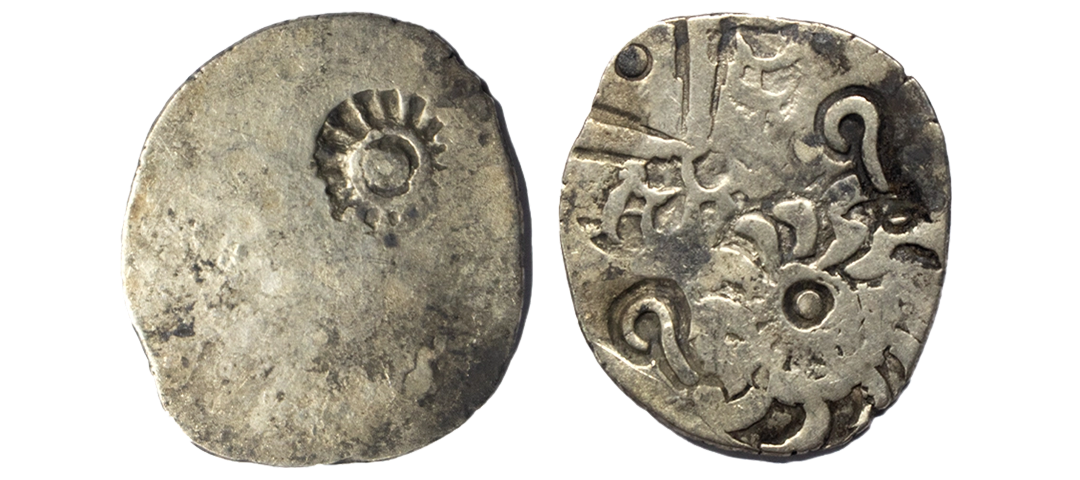 Archaic Coinage, Punch Marked, Kashi Janapada under Kosala Janapada (c. 525-465 BC), Silver Vimshatika, 4.61Grms, Jakhania hoard type, OBV: Four symbol type including whorl symbol twice and two different geometric symbol, REV: Sun symbol as a banker mark. (Rajgor # Series 58). Fine+.