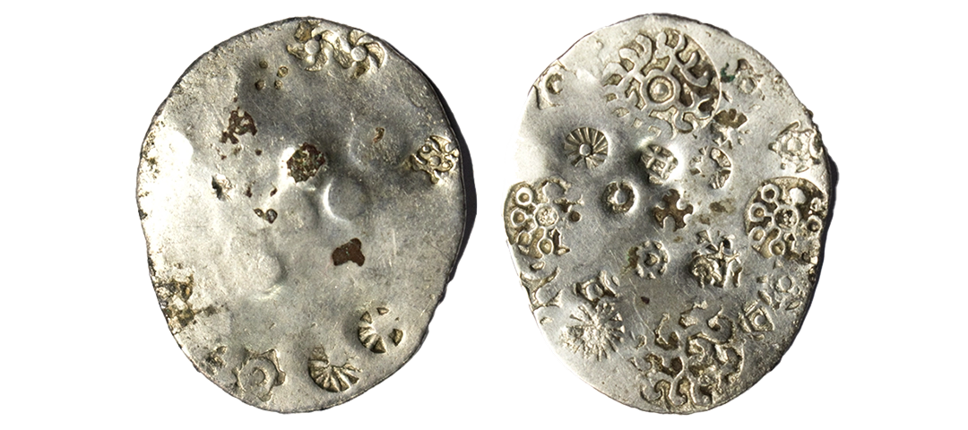 Archaic silver punch-marked coin - Middle Ganga Valley (attributed to 'Kashi Janapada'), c.400-350 BC, Vimshatika standard, scyphate shape and fabric, Rajgor 708, 4.64g. Obv: Four symbols of ABBC configuration - two large 'whorl' marks with anticlockwise sprigs, one large whorl with clockwise sprigs and one whorl without a central circle; many small banker's marks. Rev: a few small banker's marks.Extremely fine, Very rare.