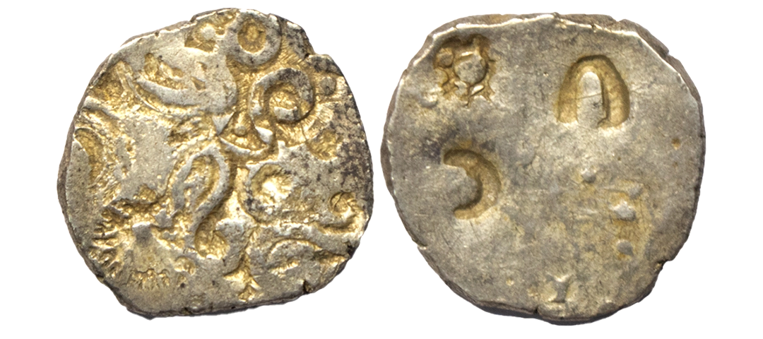 Ancient, Punch Marked Coinage, Kosala Mahajanapada (5th-4th Century BC), Silver Half Vimshatika, 3.28 gms, Obv: Elaborate Flower symbol and other punches, Rev: Multiple Banker’s marks, Hardaker, # Non imperial series, Series 3, KO 47, pg 190, very fine, rare.