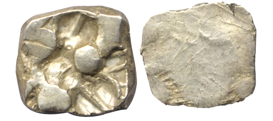 Archaic Coinage, Punch Marked, Panchala Janapada (c. 400-350 BC), Silver 1/2 Karshapana, 1.98Grms, Obv: A single composite of geometric symbol, Uniface. (Rajgor Series # 73). Very Fine.