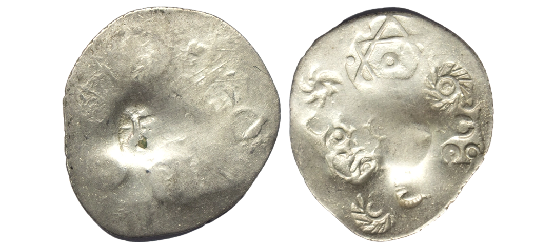 Archaic Coinage, Punch Marked, Magadha Mahajanaapada (c. 600-400 BC), Silver Karshapana, 3.44Grms, G/H series I, Five symbol types, OBV: Radiate Sun, five pointed star and other geometric symbols, REV: Banker marks. (Rajgor # Series 12). Very Fine.