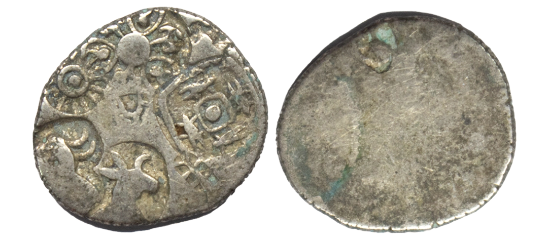 Archaic Coinage, Punch Marked, Imperial Magadha (c. 400-350 BC), Silver Karshapana, G/H series III, five symbol type, OBV: Sun, six armed, bull, elephant and four fishes surrounding square frame, Uniface. (Gupta & Hardaker # 319). Very Fine+.