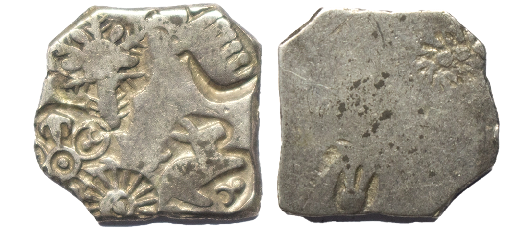 Archaic Coinage, Punch Marked, Imperial Magadha (c. 400 BC), Silver Karshapana, 3.35Grms, G/H series III, Five symbol type, OBV: Sun, six armed, elephant, rabbit surrounding taurine and like a palm tree. (Gupta & Hardaker # 305). Very Fine+.