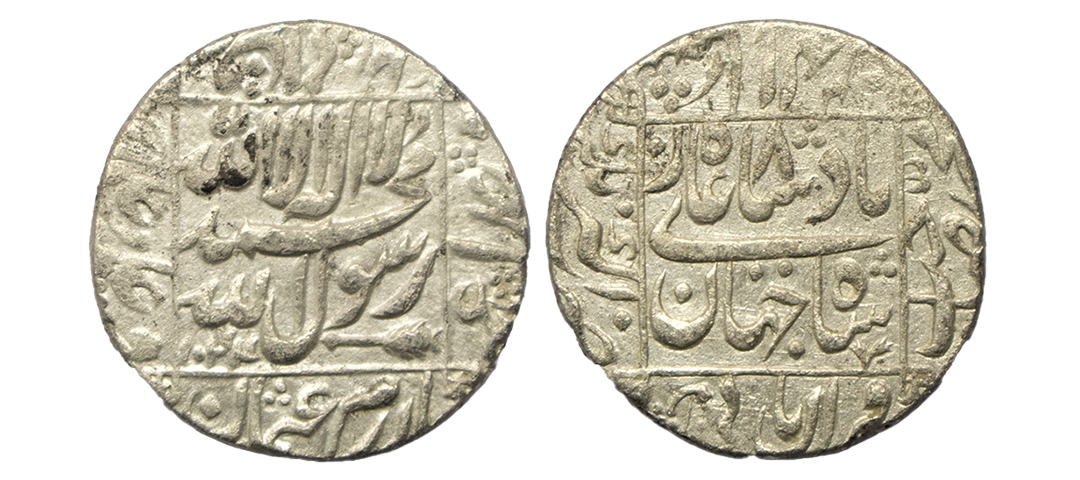 Imperial Magadhan silver punch-marked Karshapana coin (200-180 BC), GH series VII, no. 590, 3.24g. Obv: Three human figures constituting a single punch, peacock on five arched hill, etc. Rev: Peacock on five arched hill. Extremely fine, Very scarce.