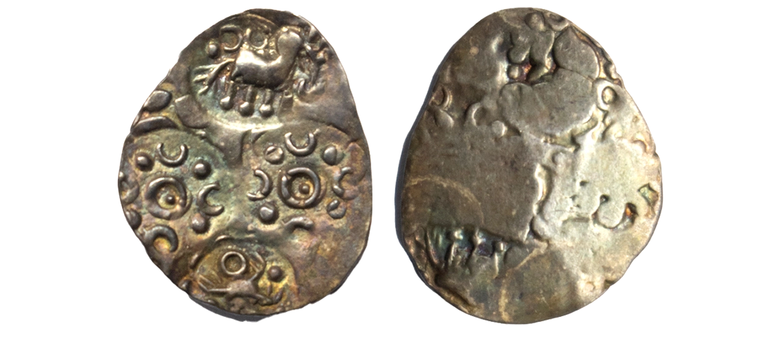Archaic silver punch-marked coin, Wainganga-Wardha Valley region, usually attributed to 'Vidarbha Janapada', ½ Karshapana, ABBC configuration, (400-350 BC), not listed in Rajgor, 1.54g. Obv: Four punches: 1x elephant facing right, 2x tripoint symbol with crescents and dots, 1x bulls yoked to a plough. Rev: Traces of an undertype.Very fine+, Rare.