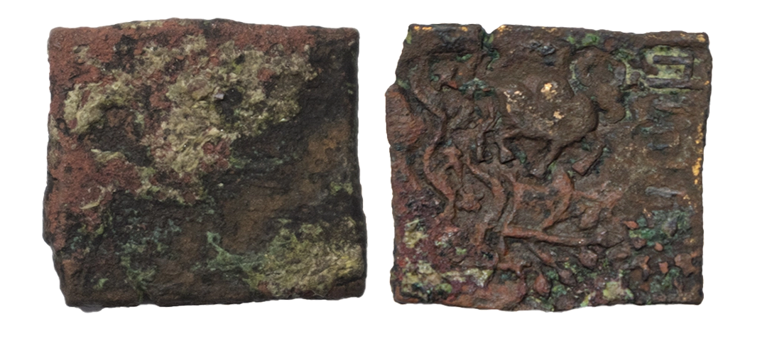 Ancient, Bhagila City State (2nd-1st Century BC), Copper Punch Mark Coin, 4.79 gms, Obv. Punches of Bull, tree in railing, legend and river, Legend reads as ‘Bhagilaya’, Rev. Uniface, SJ Mangalam # Type 1, Var 3, very fine, rare.