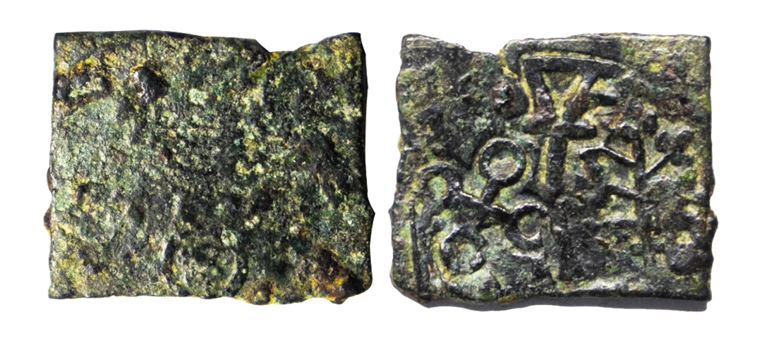 Post-Mauryan, Vidisha region, Punch Marked, Copper Unit, Grms, Four orbed ujjaini, indradhvaja and tree-in-railing symbol, REV: Blank. (Pieper # 893). Very Fine.