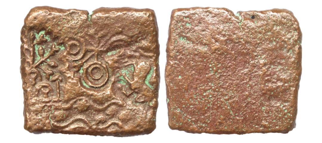 Post-Mauryan, Vidisha region, Punch Marked, Narmada valley, Copper Unit, OBV: Double orb ujjaini, tree-in-railing, river with fishes and horse symbol, Uniface. (Pieper # 882). Very Fine.