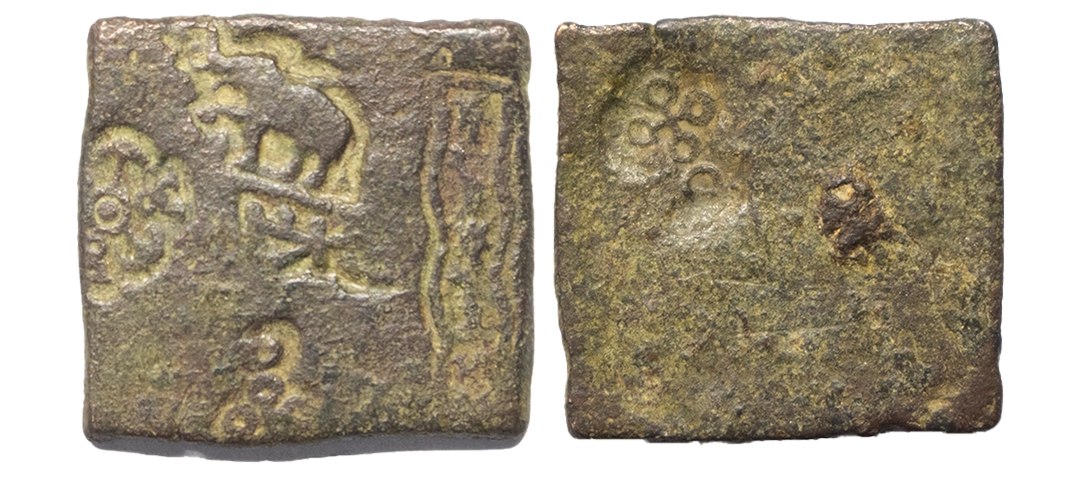 Post-Mauryan, Vidisha region, Punch Marked, Copper Unit, 7.91Grms, OBV: Elephant to left with trunk upraised, indradhvaja-in-railing, six armed, four orbed ujjaini with crescent above and river with fishes, REV: Four orbed ujjaini symbol above crescent as counter mark. (Pieper # 876). Very Fine+.