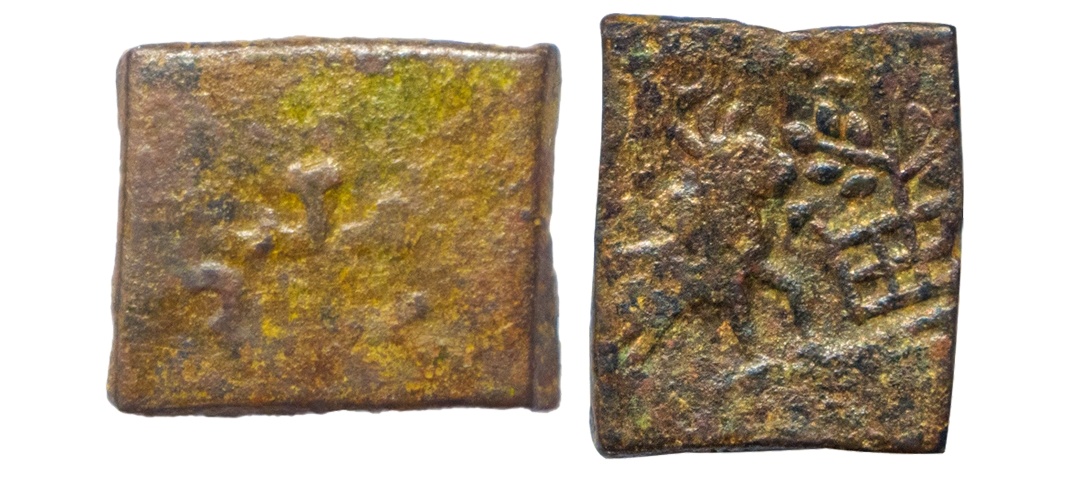 Post-Mauryan, Narmada Valley, Central India, Uniscribed type, Copper Unit, 5.55Grms, OBV: Bull walking to right side front of tree-in-railing, REV: Four nandipada symbol. (Pieper # 523). Fine.