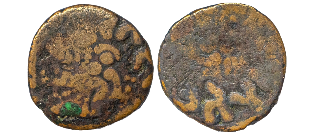 Ancient, Mathura region, Gomitra (2nd-1st Century BC), Copper Heavy Unit, 6.09 gms, Obverse: Standing deity Lakshmi, Tree at left, Shrivatsa and Ujjain symbols at right, Brahmi legend ’Gomitasa’ above, Reverse: Deity seated on a three headed elephant facing front, Pieper # 1261, pg. 191, fine, very rare.