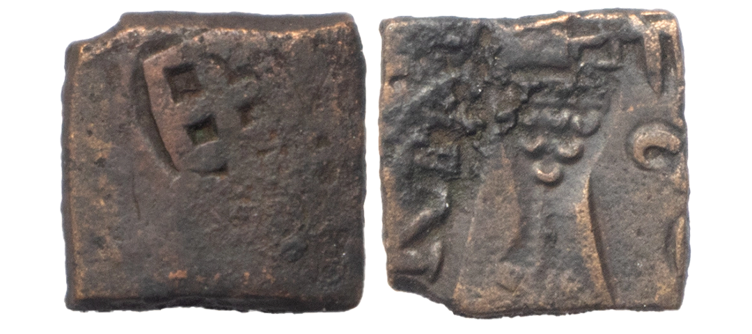 Post-Mauryan, Sena Dynasty of Erikachha, Betwa River Valley, Sahasasena, Copper Unit, 2.25Grms, Punch Marked type, OBV: Brahmi legend in two lines mentioning the ruler name and in centre palm tree on hill, REV: Yupa symbol. (Pieper # 961). Fine+.
