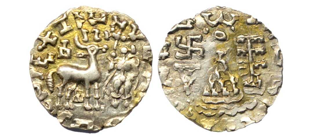 Kunindas, Amoghabhuti (c. 200 BC), Silver Drachma, 2.15Grms, Three arched hill with parasol under Deer Type, OBV: Deer standing to right srivatsa and rectangular vase above, three arched hill with parasol symbol between deer legs and above parasol, goddess standing on beaded lotus flower, holding a flower, around Brahmi legend, 'Rajnya Kunindasa Amoghabhutisa Maharajasa’, REV: Six arched hill above nandipada below river symbol, tree-in-railing, indradhavaja above svastika and around Kharoshthi legend 'Maharaja Amoghabhutisa’. (Pieper # 1200). Very Fine+.