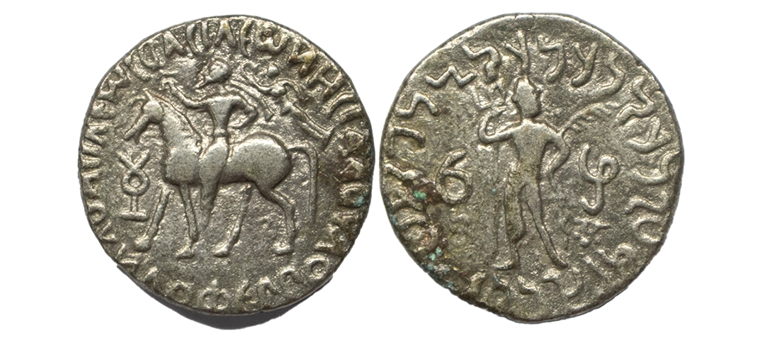 Indo-Parthians, Gondophares (c. 40-5 BC), Silver Tetradrachm, OBV: King on horseback walking to left side above nike flying behind him with wreath, monogram front of the horse and around Greek legend ‘BAΣIΛEWΣ BAΣIΛEWN MEΓAΛOY YNΔOΦEPPOY’, REV: Shiva standing facing to right side, holding trident in right hand and palm in left hand around Kharoshthi legend ‘Maharajasa rajarajasa tratarasa devavratasa Gudapharasa’. (Bopearachchi & Rahman # 983). Extremely Fine+.