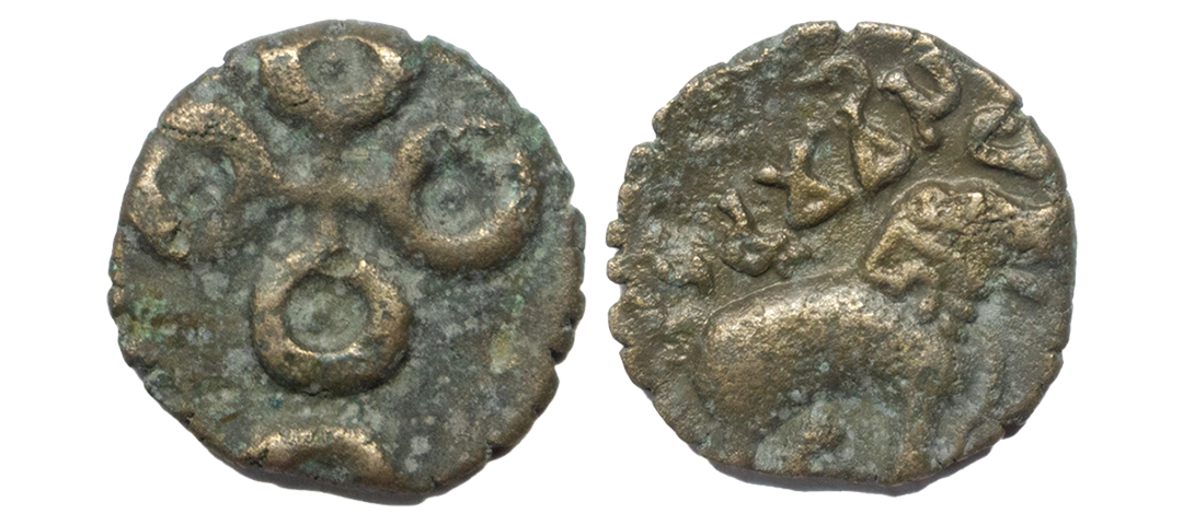 Satavahanas, Sri Pulumavi (c. 85-120 AD), Tarhala (Vidarbha) Type, Potin, OBV: Elephant walking to right with trunk upraised above Brahmi legend ‘Pulumavisa’, REV: Four orb ujjaini symbol with crescent, dot on each orb. (V.V. Mirashi # Studies in Indology Vol. III, Nagpur). Very Fine.