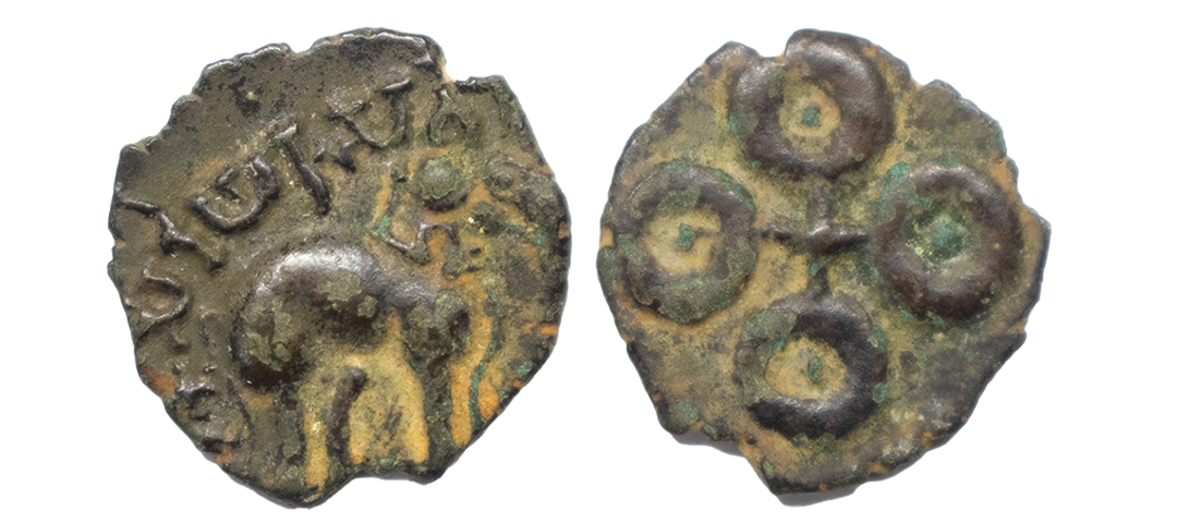 Satavahanas, Yajna Satakarni (c. 170-200 AD), Tarhala type, Vidarbha Region, Potin Unit, 11.56Grms, OBV: Elephant walking to right with trunk upraised (off flan) Brahmi legend on its back 'Siri Yajna Sata[kanisa]. REV: Four orb ujjaini symbol with dot in each orbs. (V.V. Mirashi # Studies in Indology Vol. III). Very Fine+.