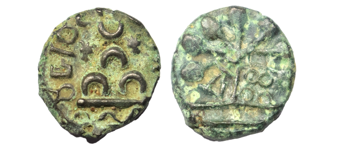 Ancient, Maharathis from Vidarbha, Maharathi Talathata (c. 150-200 AD), Alloyed Copper Unit, 3.70 gms, Obverse: Six arched hill surmounted by a crescent. Brahmi legend above reading “MaHaRaThiSa(TaLaThaTaSa)”, Reverse: Tree in railing with leaves radially emerging, Pieper #2524, very fine, rare.