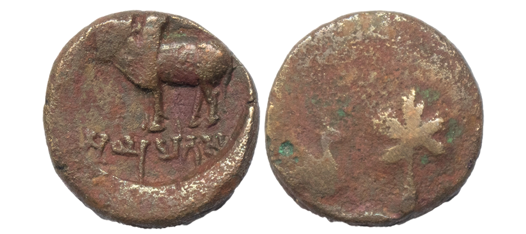 Ancient Saketa region - monarchical die-struck coinage of Ayodhya area, copper coin of Ayumitra (c.200-300 AD), PAIC 1064, 6.25g. Obv: Bull standing facing left in front of a spear; Brahmi legend Ayumitra… below. Rev: Peacock in profile to right and a palm tree.