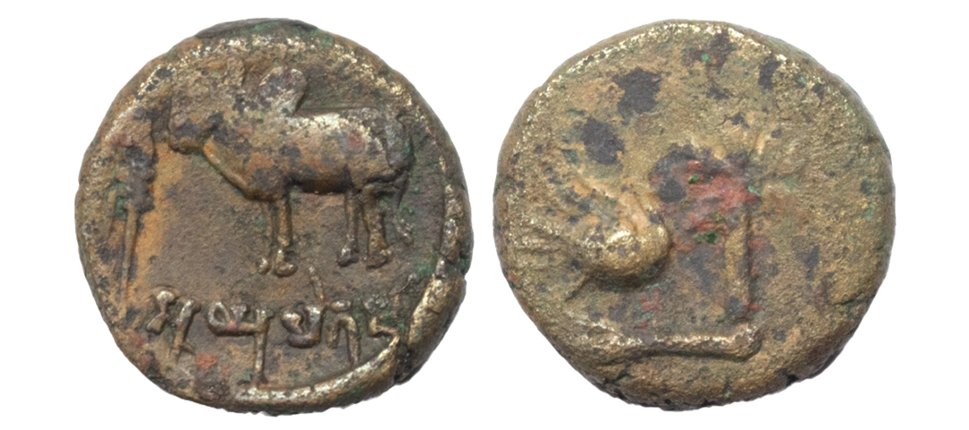Ancient Saketa region - monarchical die-struck coinage of Ayodhya area, copper coin of Ayumitra (c.200-300 AD), PAIC 1064, 8.51g. Obv: Bull standing facing left in front of a spear; Brahmi legend Ayumitra… below. Rev: Peacock in profile to right and a palm tree.
