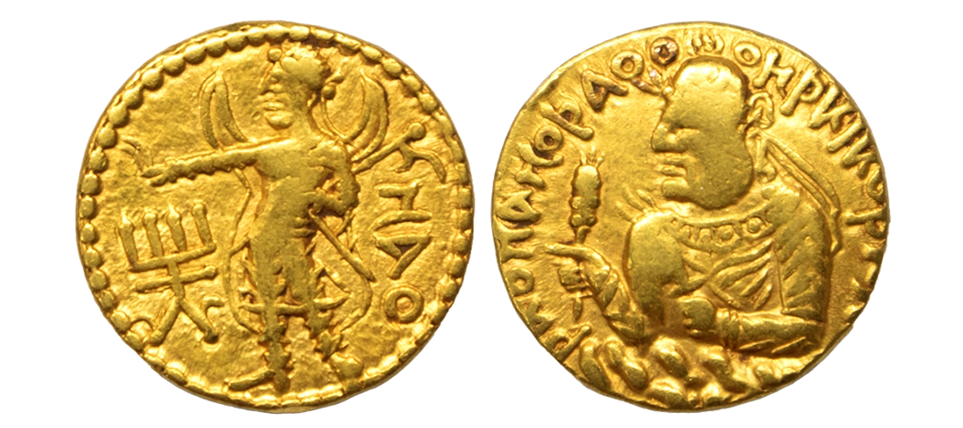 Kushans, Huvishka (c. 155-190 AD), Gold Dinar, 7.61Grms, OBV: Nimbate, diademed and crowned half-length bust of the king to left emerging from the clouds, wears round helmet, crest ornament with jewelled collar, holding mace-sceptre in right hand and hilt of sword in left with around Greek legend, REV: Lunar deity Mao (Mithra) standing facing left, crescent emerging from shoulders and holding a diadem in outstretched hand, sword held by buckled belt, tamgha on left field and label ‘MAO’ on right field. (Jongeward, Cribb & Donovan # 756).