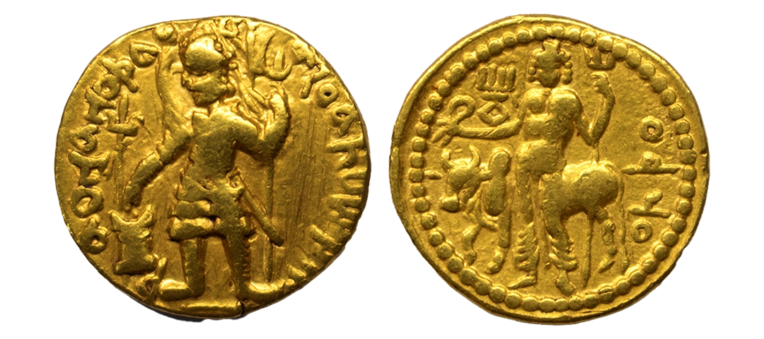 Ancient, Kushanas, Vasudeva I (c. 189-225 AD), Gold Dinara, 7.77 gms, Obv: Crowned, diademed king standing, holding trident and sacrificing at altar at left, Bactrian legend around ‘þAONANOþAO BA ZOΔηO KOþANO’ (King of Kings Bazodeo Kushan), Rev: Two-armed Shiva standing facing, holding trident and diadem, Nandi behind to left, Bactrian legend left ‘OηþO’, tamgha at right, Dotted border around, Göbl # 504, very fine, very rare.