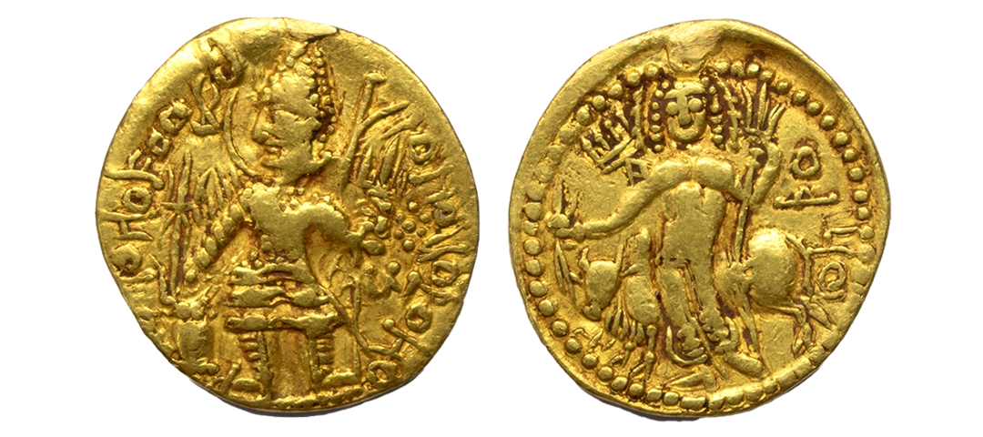 Ancient, Kushanas, Vasudeva II (c. 267-300 AD), Gold Dinara, 7.52 gms, Obv: Crowned, diademed king standing, holding trident and sacrificing at altar at left, Bactrian legend around ‘þAONANOþAO BA ZOΔηO KOþANO’ (King of Kings Bazodeo Kushan), Rev: Two-armed Shiva standing facing, holding trident and diadem, Nandi behind to left, Bactrian legend left ‘OηþO’, tamgha at right, Dotted border around, Göbl # 504, very fine, very rare. Condition as per image.