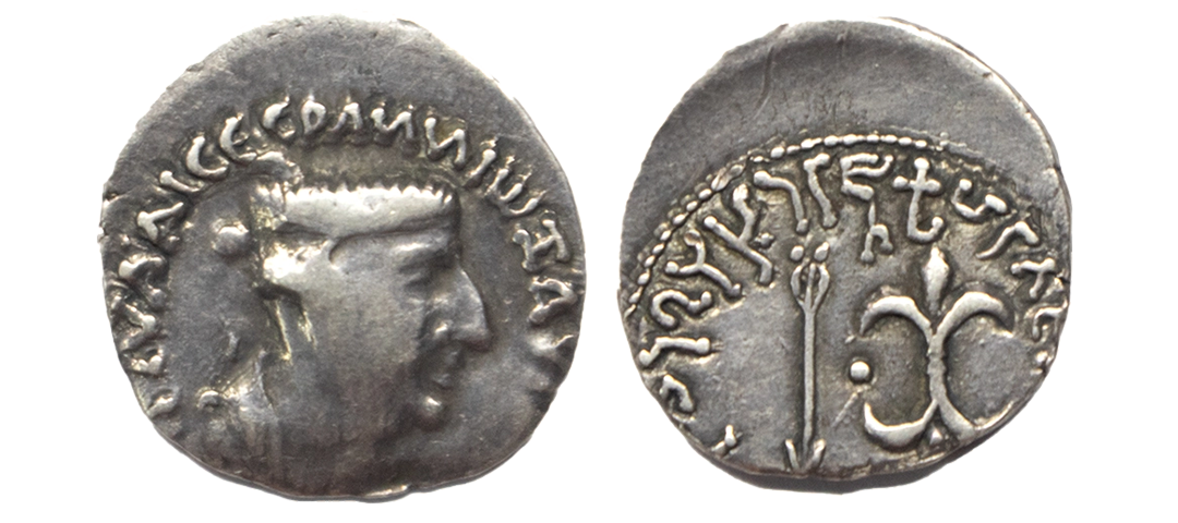 Western Kshatrpas, Nahapana (c. 60-78 AD), Silver Drachma, OBV: Bust of Nahapana facing to right, around corrupt Greek legend, REV: Arrow and thunderbolt with Kharoshti legend and Brahmi legend ‘Rajno Kshaharatasa [Nahapanasa]’ within dotted border. (Fishman # 3.2). Very Fine+.