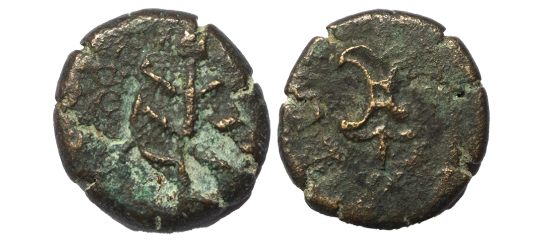 Ancient, Western Kshatrapas, Kshaharata family, Nahapana (1st Century AD), Bhokardan type, Copper Unit, 4.60 gms, Obverse: Kshaharata dynastic symbols of thunderbolt and arrow, Thunderbolt is ornately represented, Reverse: Tree in railing, Pieper # 3345, fine, rare.