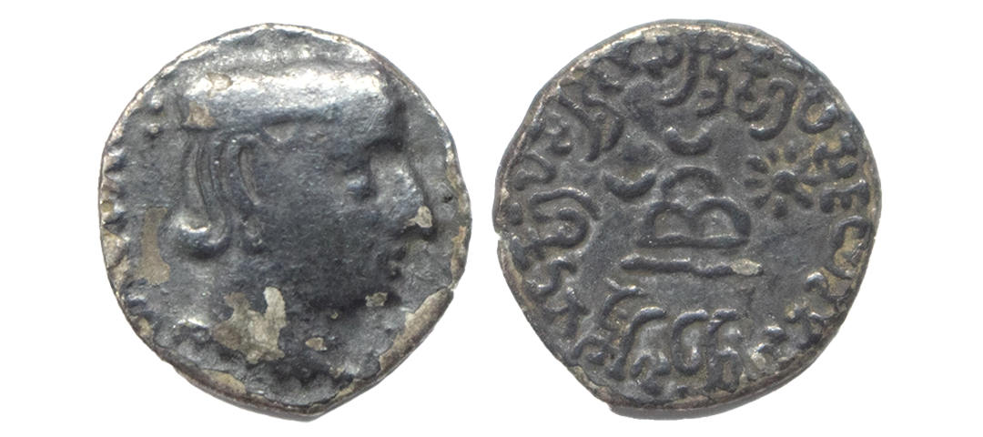 Western Kshatrapas, Rudradaman I s/o Jayadaman (c. 141-165 AD), as Mahakshatrapa, Silver Drachma, 4.15Grms, Obv: Bust of king facing to right with greek letters, Rev: Three arched hill with crescent above, sun on right and moon to left, around Brahmi legend ‘Rajno kshatrapasa Jayadamasaputrasa Rajno mahakshatrapas Rudradamasa’. (Pieper # 3366). Very Fine+.