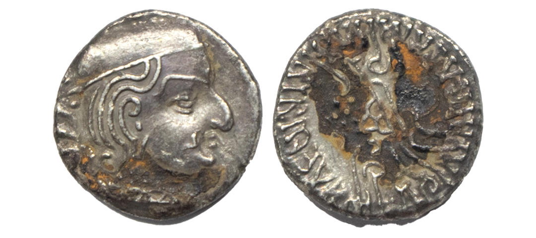 Western Kshtrapas, Kardamaka Family, Vijayasena (238-239 AD), Silver Dramma, 2.96Grms, OBV: Bust of king to right, Corrupt Greek legend around, REV: Three arched hill with crescent on top, flanked by sun and moon, wavy line below, Brahmi legend around ‘Rajno Mahakshtrapasa Damasenaputrasa Rajno Mahakshtrapasa Vijayasenasa’. ( Fishman # 23). Very Fine.