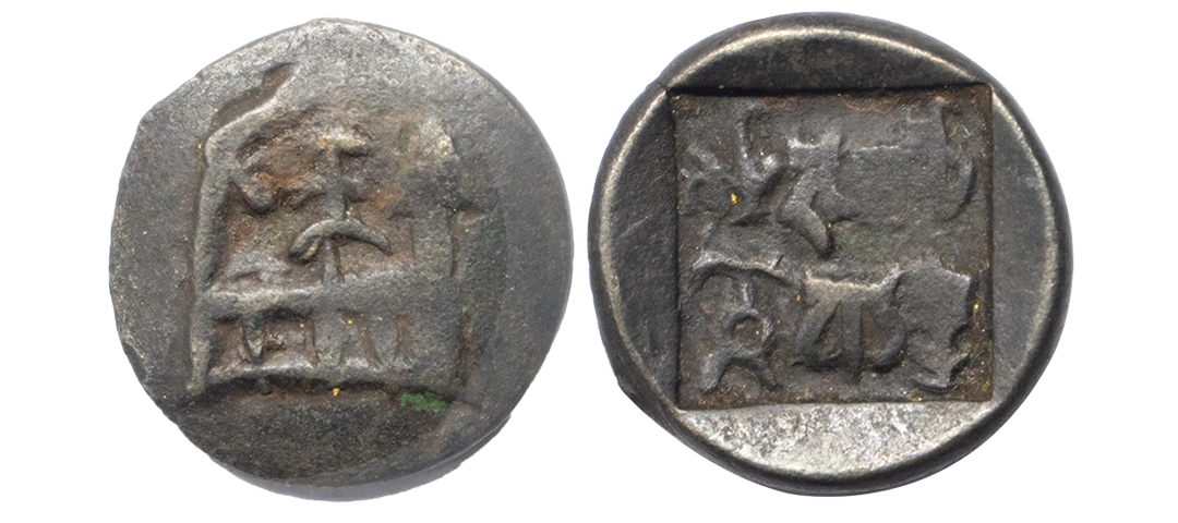 Panchala of Ahichhatra Dynasty, Dhruvamitra (c. 200 AD), Copper Alloyed, 4.55 Grms, OBV: Royal symbol of Panchala on top and below Brahmi legend 'Dhruvamitasa' in a deep square incuse, REV: Trident on pedestal. (Pieper # 1367). Very Fine+.