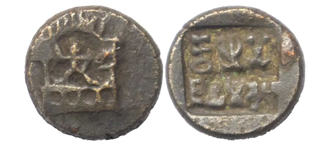 Panchalas of Ahichhatra Dynasty, Jayamitra, Copper Alloy, 3.90Grms, OBV: Royal symbol of Panchala on top and below Brahmi legend 'Jayamitasa' in a deep square incuse, REV: Male god standing on platform holding objects above radiate arche. (Pieper # 1337). Extremely Fine.