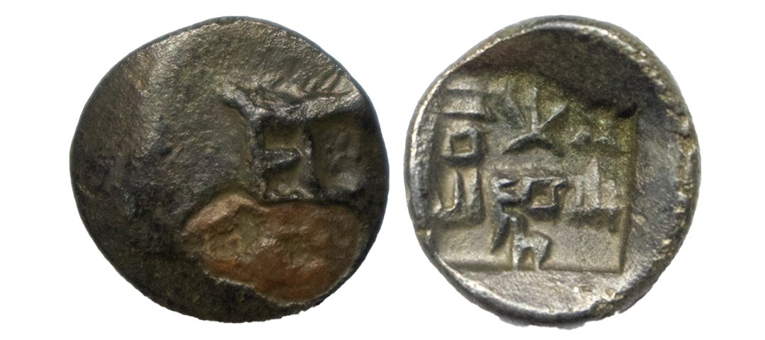 Panchala of Ahichhatra Dynasty, Yajnabala, Copper Alloy, 0.80Grms, OBV: Three Panchala royal symbol on top and below Brahmi legend 'Yajnabalasa', REV: Trident on pedestal. (Pieper # 1369). Very Fine.